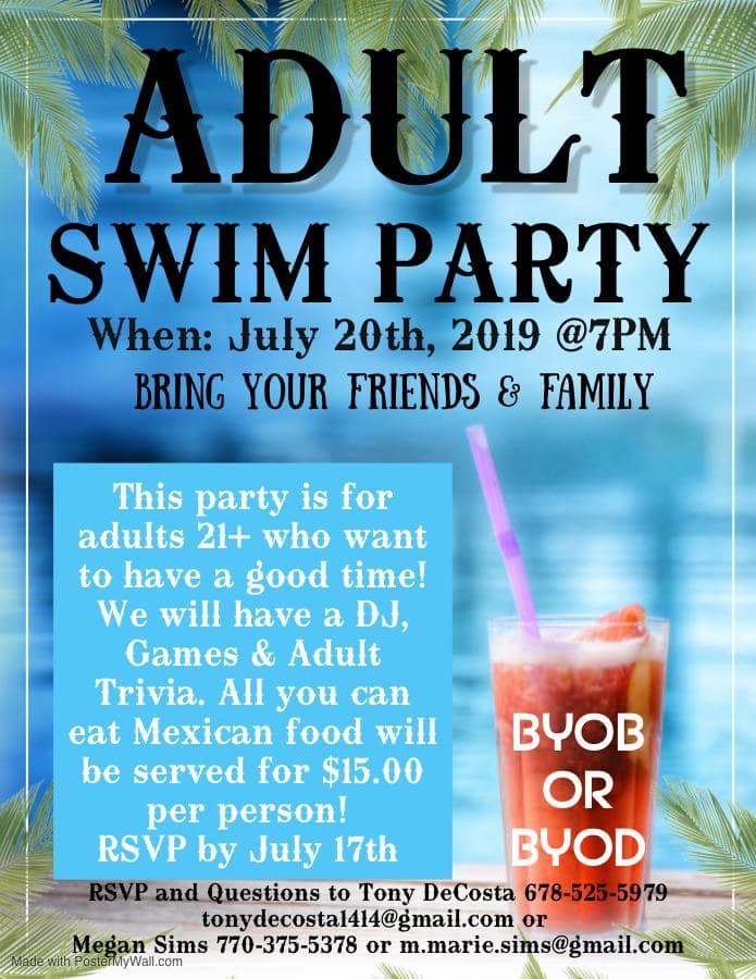 Also, in response to the interest of many members, we will be having an Adult Only Swim Party. This event is only for members that are 21 years of age and over. There will be a DJ and “all you can eat” Mexican food available for $15. You will need to RSVP and prepay if you are planning to eat. Please click on the attached flier for full details. Have a fantastic week!