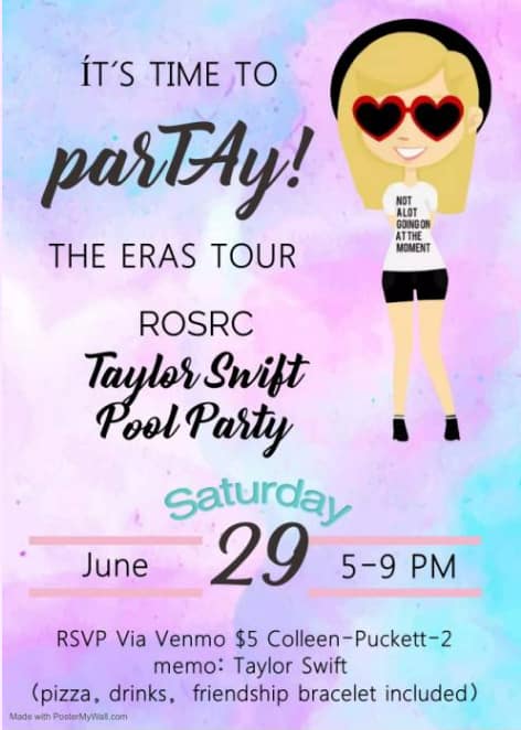 Reminder – Taylor Swift Night June 29th 5-9pm Posted on June 25, 2024June 25, 2024 by Michael All kids welcome – even teens and tweens RSVP by Venmo no later than Wednesday this week to ensure we have enough supplies and food! Category: Event, ROSRC News